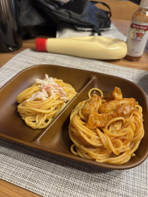 カニクリームパスタと豚肉トマトパスタ